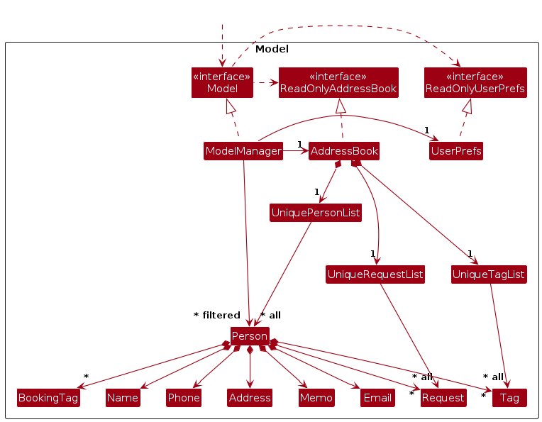 Person objects (which are contained in a UniquePersonList object).Person objects (e.g., results of a search query) as a separate filtered list which is exposed to outsiders as an unmodifiable ObservableList<Person> that can be 'observed' e.g. the UI can be bound to this list so that the UI automatically updates when the data in the list change.UserPref object that represents the user’s preferences. This is exposed to the outside as a ReadOnlyUserPref objects.Model represents data entities of the domain, they should make sense on their own without depending on other components)API : Storage.java